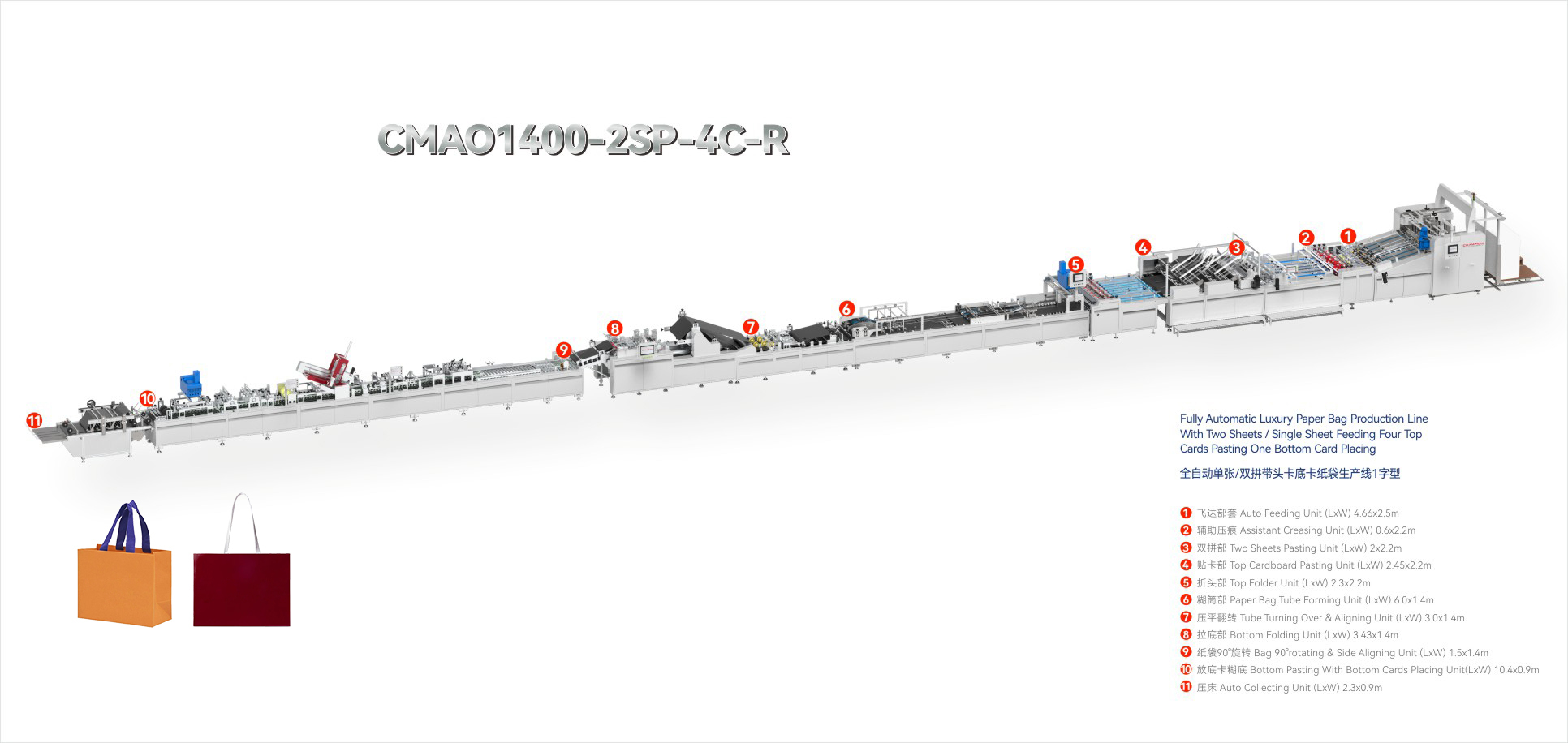 CMAO1400-2SP-4C-R Fully Automatic Luxury Paper Bag Production Line With Two Sheets/Single Sheet Feeding Four Top Cards Pasting One Bottom Card Placing