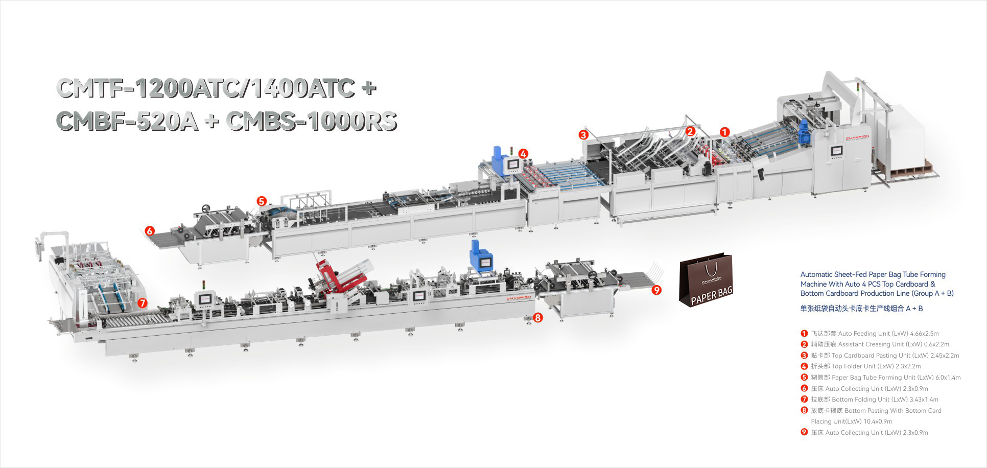 CMTF-1200ATC/1400ATC+CMBF-520A + CMBS-1000RS Automatic Sheet-Fed Paper Bag Tube Forming Machine With Auto 4 PCSTop Cardboard & Bottom Cardboard